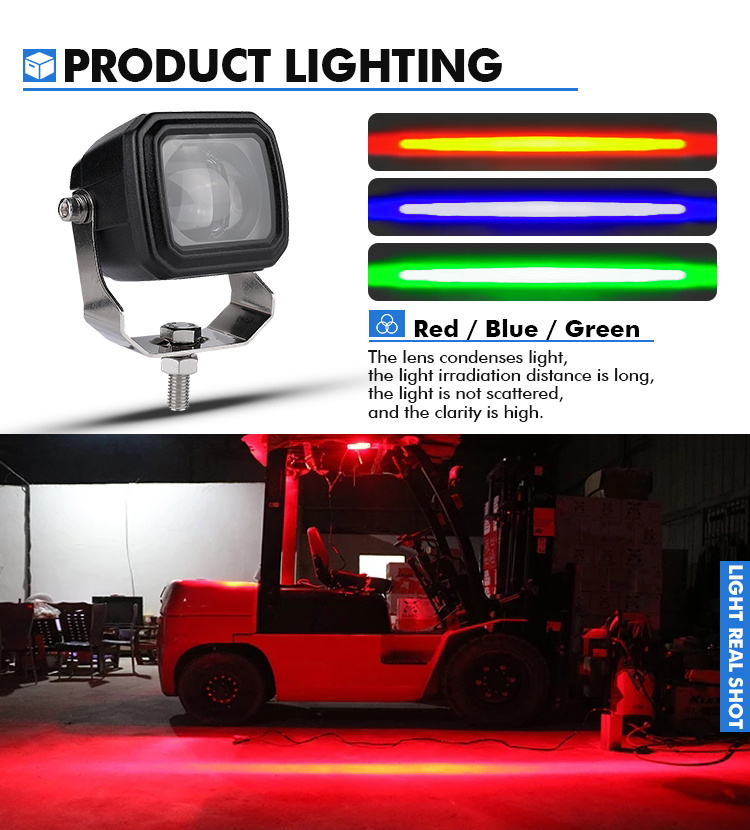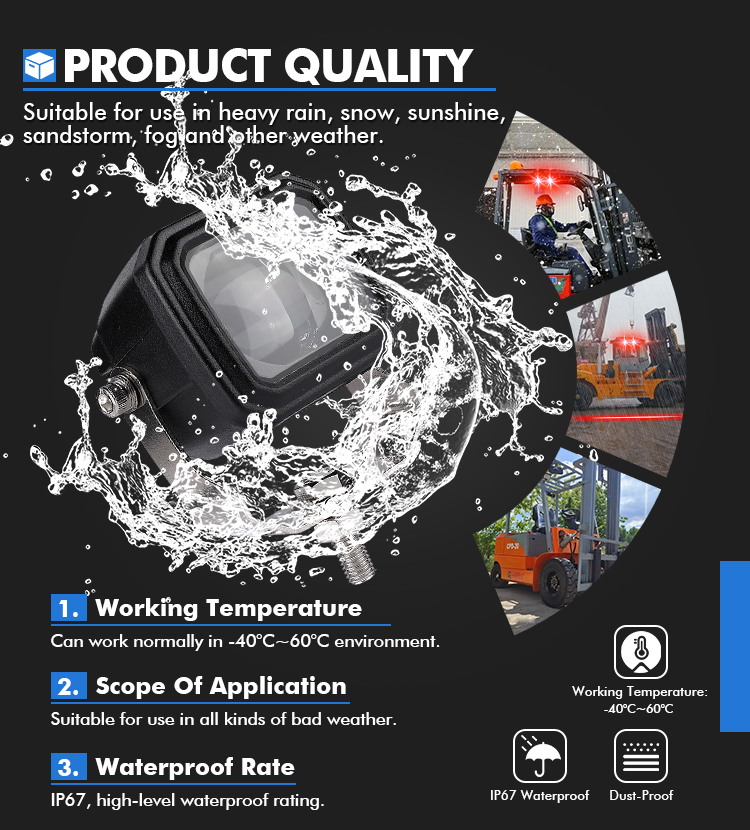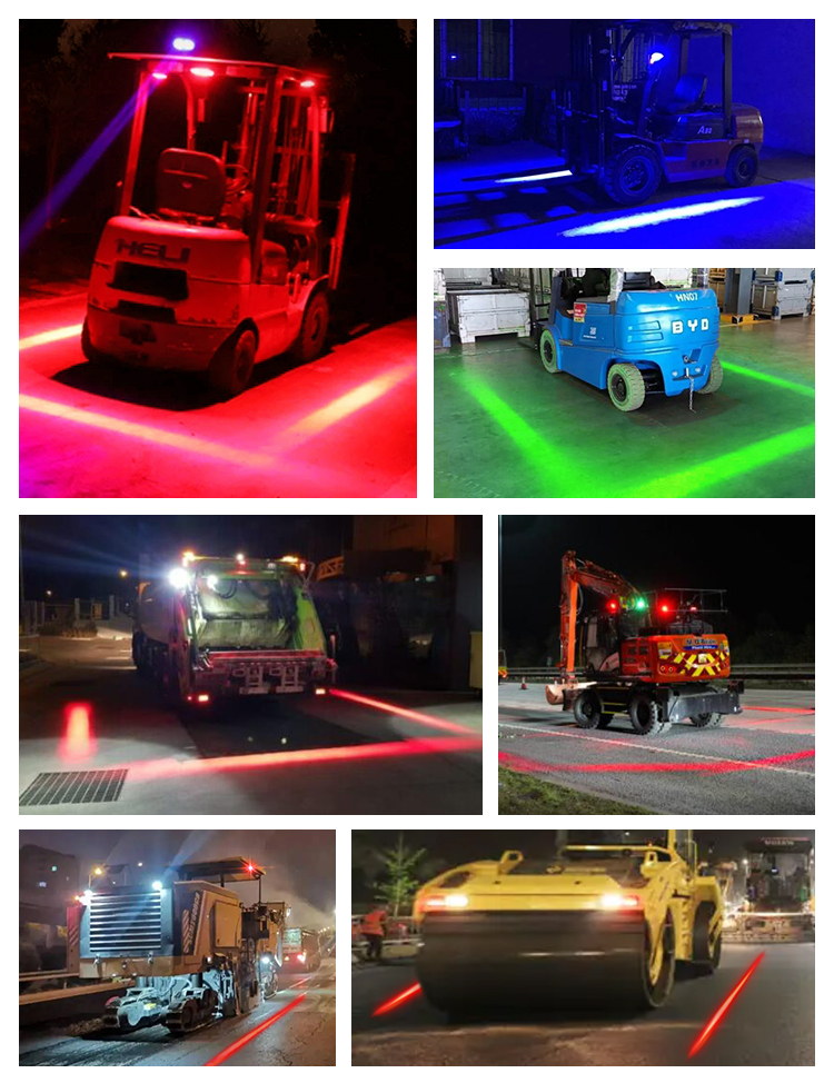 a professional safety solution for forklifts and industrial handling equipment. It projects a high-visibility ground warning zone to alert pedestrians and vehicles of the forklift’s range, reducing collision risks in warehouses, factories, and logistics/construction sites