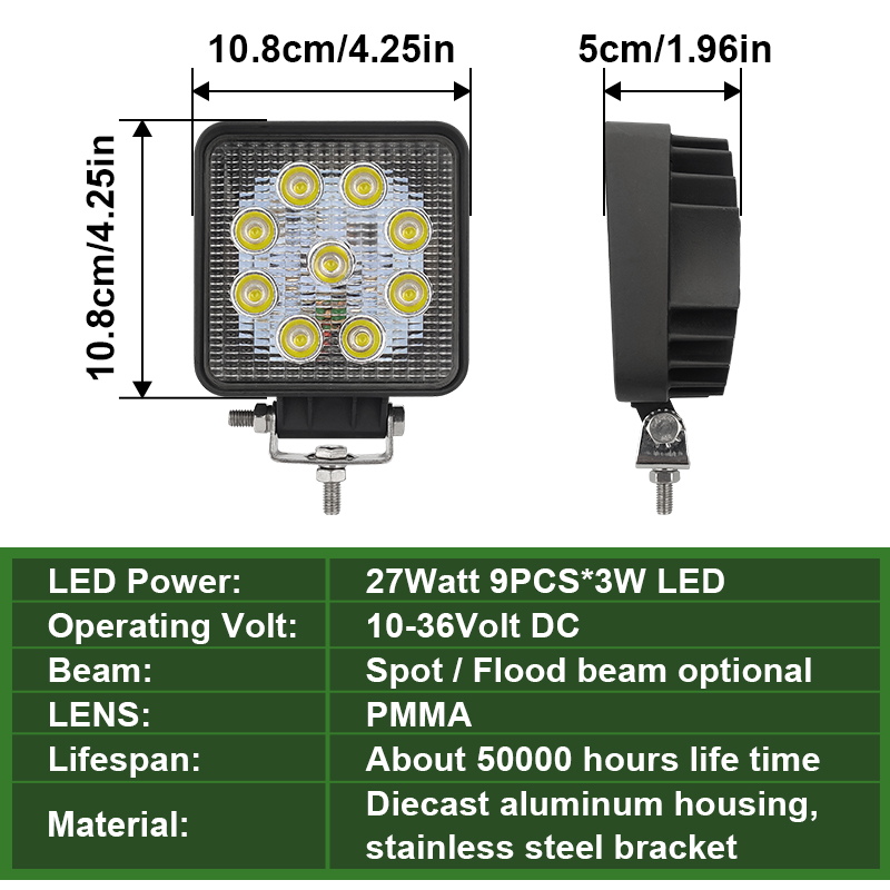 Meet the 27W Classic Square LED Work Light – the perfect blend of traditional, rugged design and modern, efficient LED technology. This light provides a robust and reliable lighting solution for a wide range of agricultural, industrial, and vehicular applications. Its compact square profile and powerful output make it an ideal direct replacement for older incandescent or halogen work lights on tractors and other machinery, offering a significant upgrade in brightness, efficiency, and longevity.