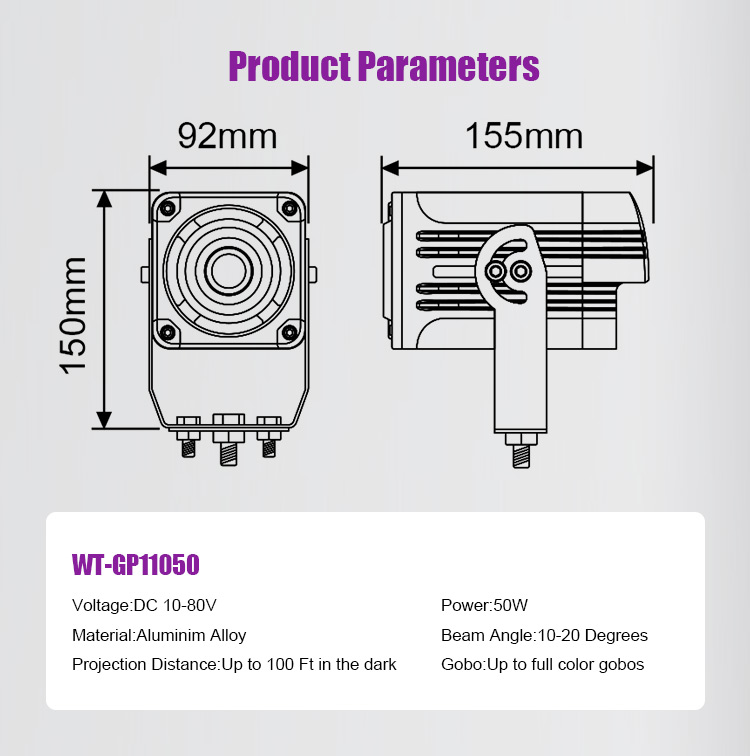 50W Industrial Gobo Logo Projector: 10-80V DC input, perfect for industrial settings. Projects custom logos clearly, durable and easy to install. Ideal for factory floors, warehouses, or industrial zones.