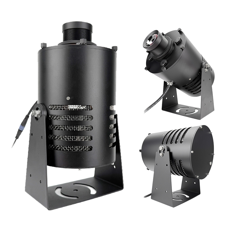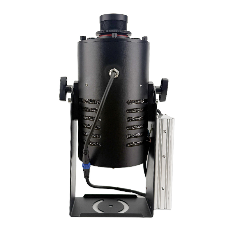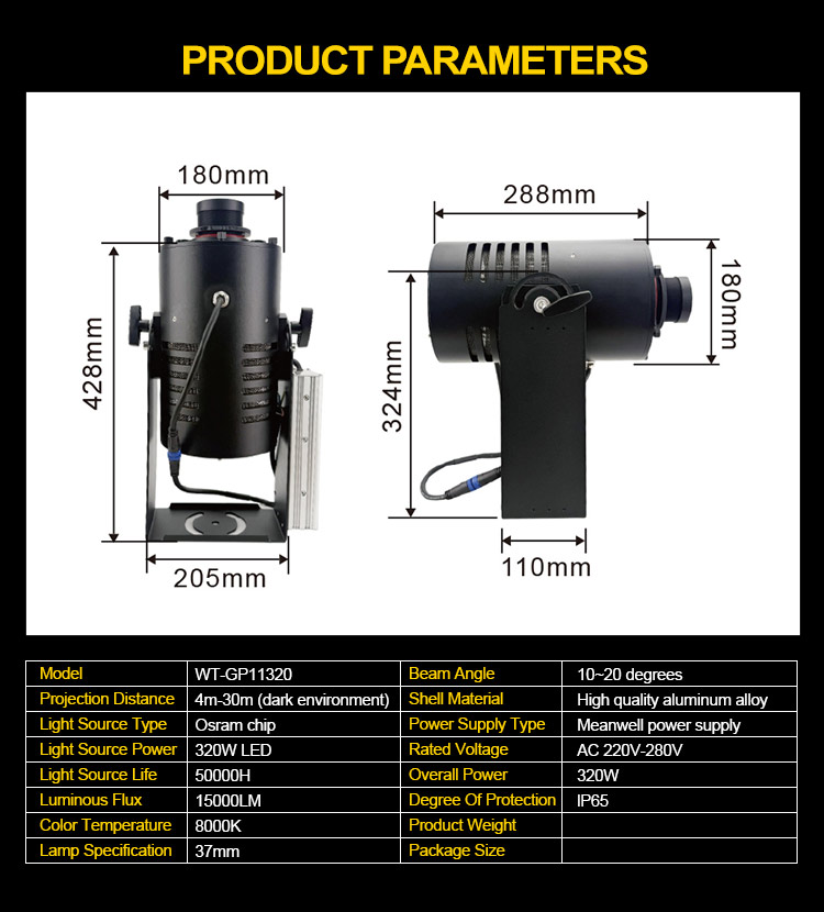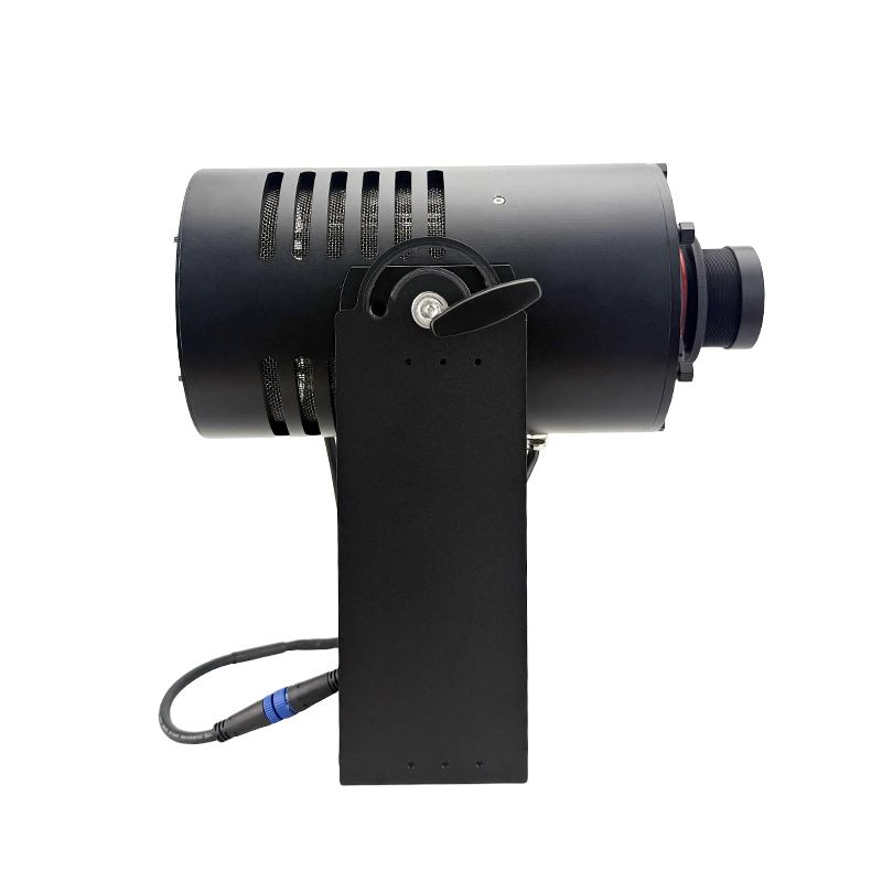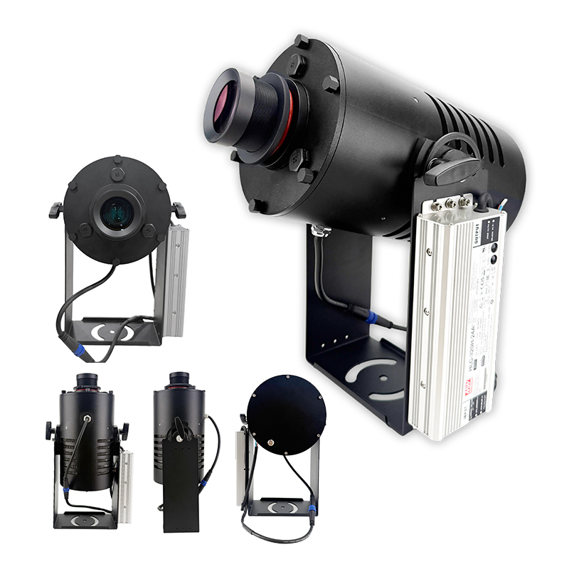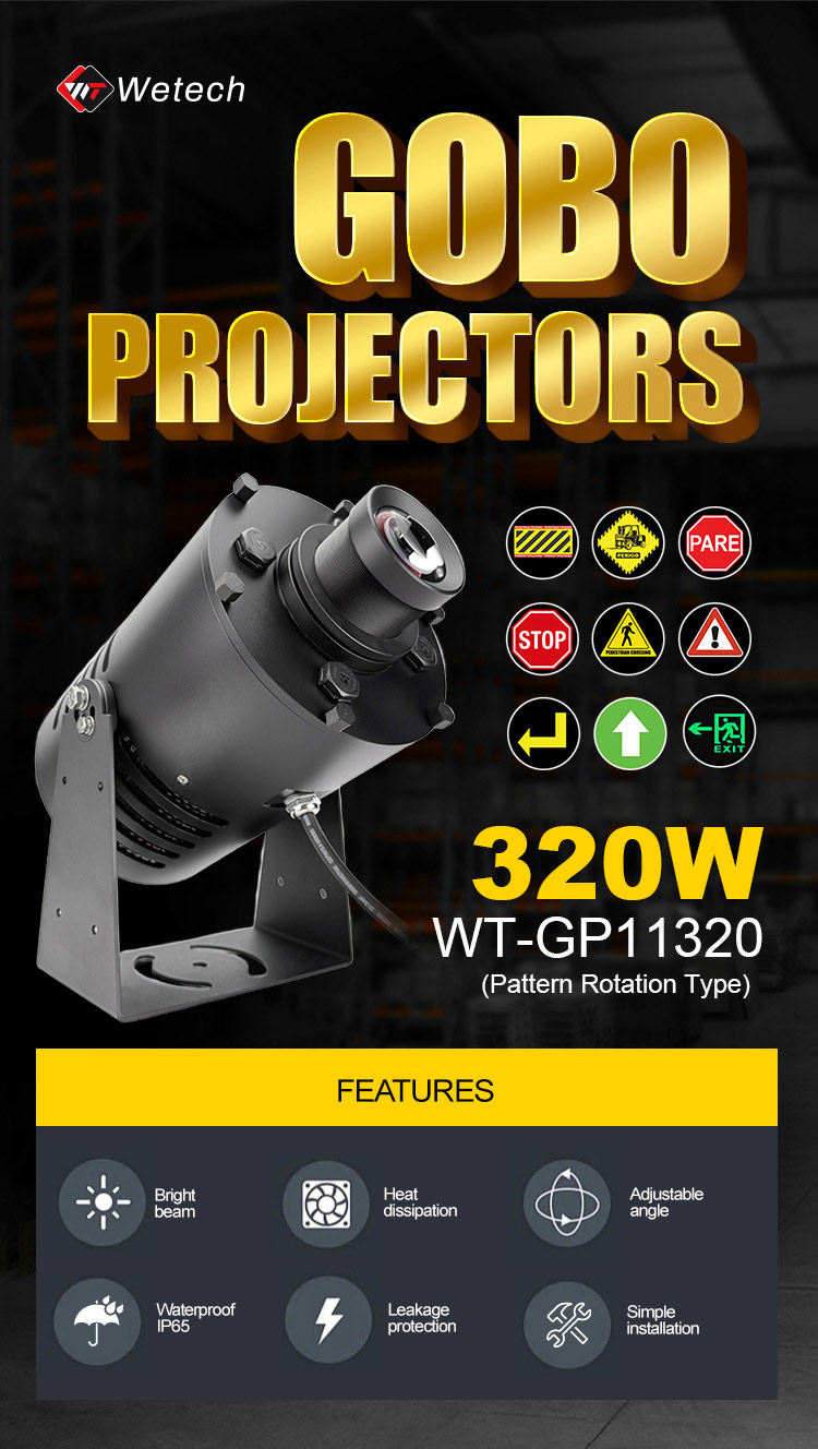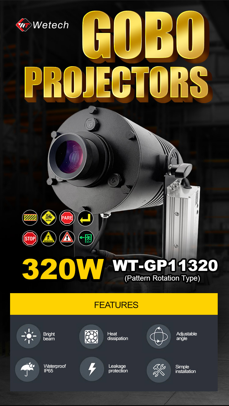 Unlike previous designs, the 320W gobo projector features a compact size and a bracket with easily adjustable mounting orientation, making it more affordable.