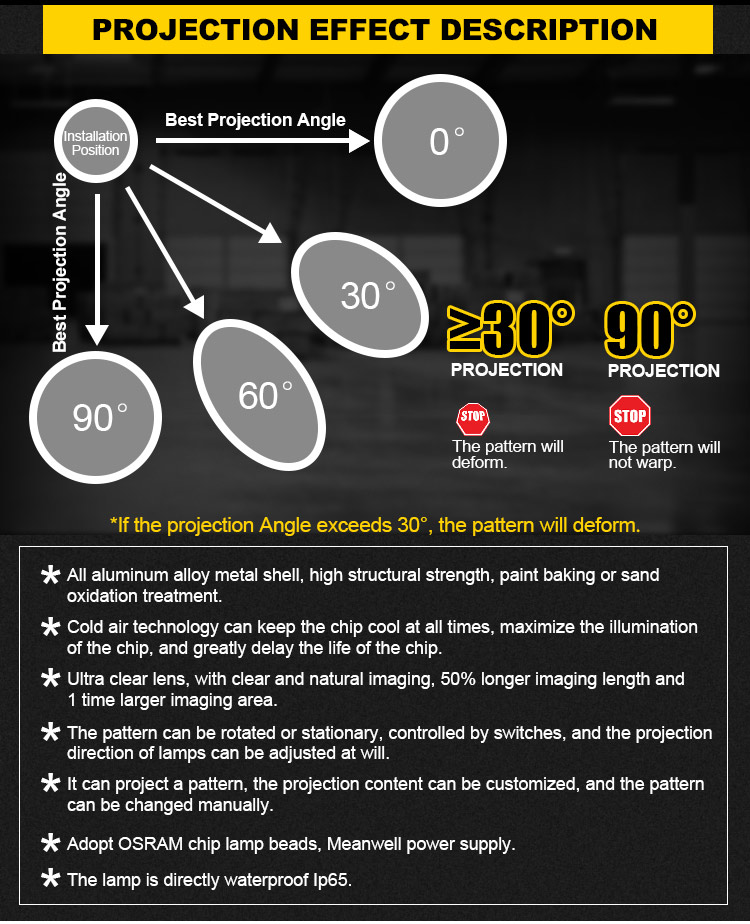 With a 320W high-power output, it produces ultra-bright, vivid projections. Clear visibility of logos or safety signage is guaranteed, even in large warehouses with ample ambient light.