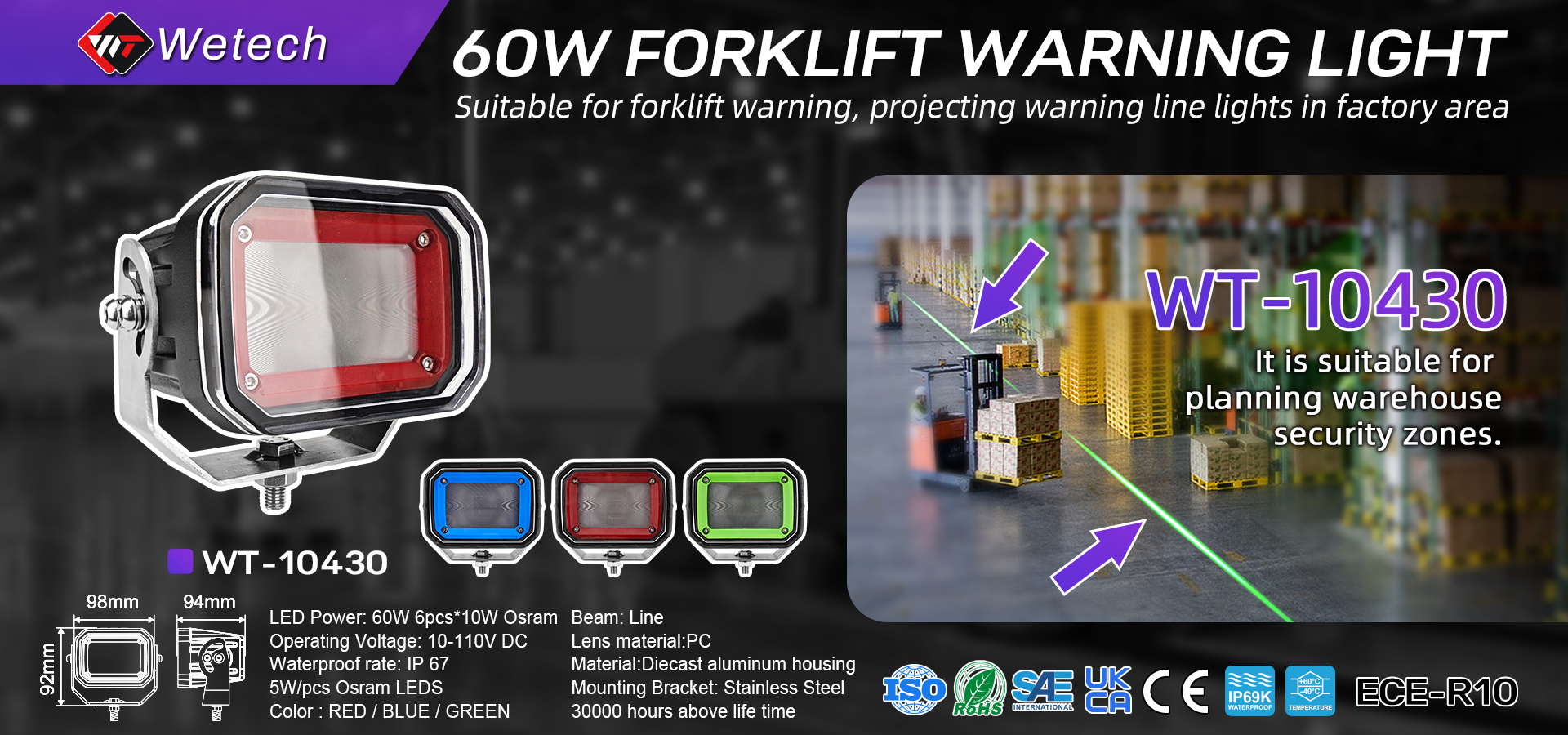 Upgrade your forklift safety with our IP67-rated 10-80V 60W warning light—durable, shockproof, and high-visibility for warehouses, construction sites & logistics hubs.