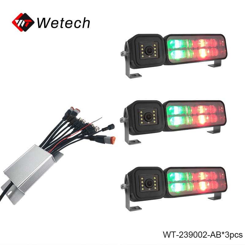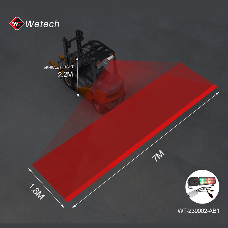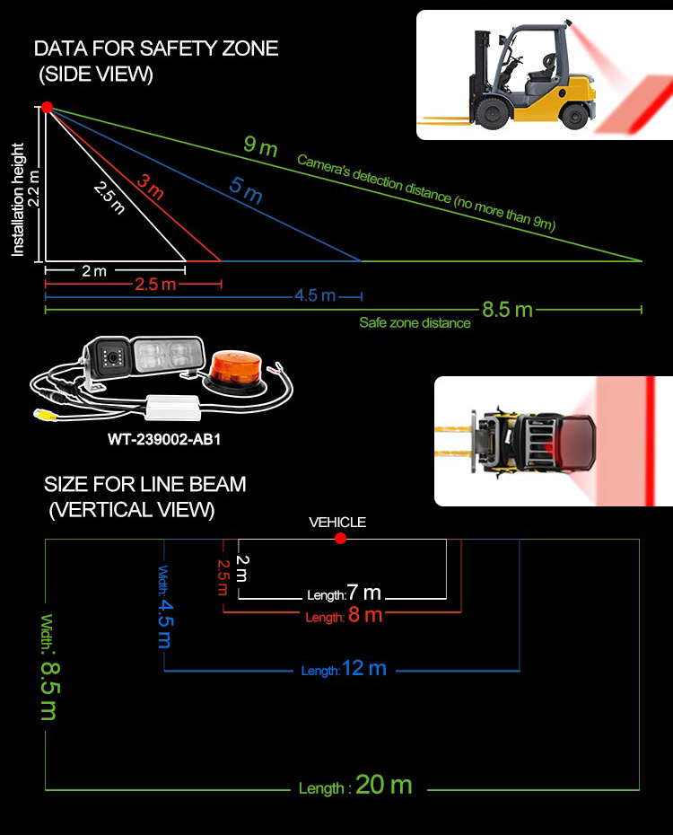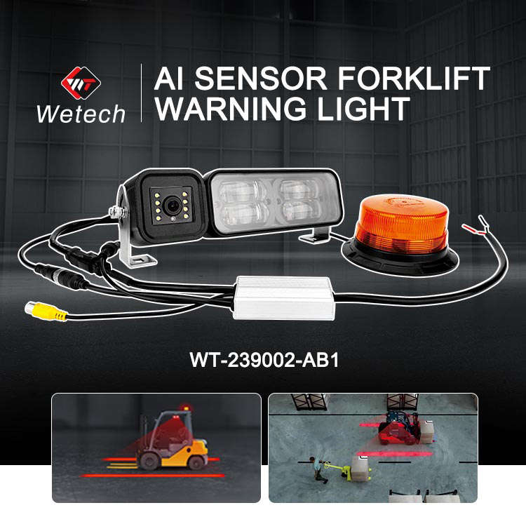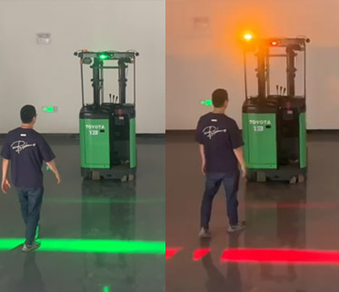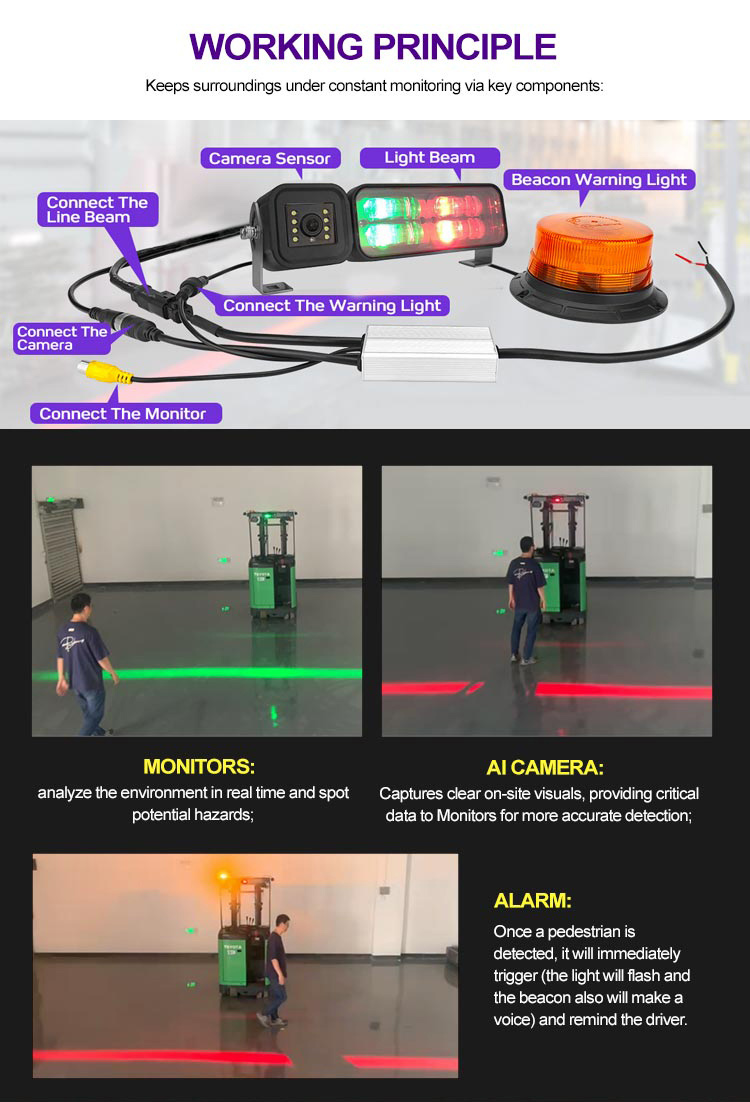 This forklift AI collision avoidance system uses red and green warning lights to detect blind spots and proximity in dangerous areas. It provides real-time alerts, effectively preventing collisions and enhancing operational safety.