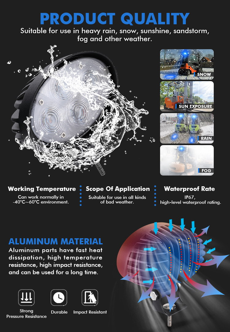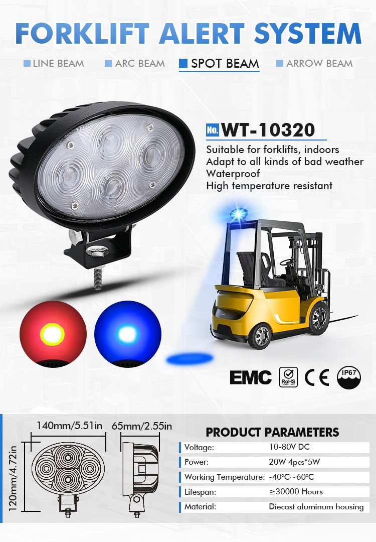 Forklift blue spot light is a simple, durable, and highly effective proactive safety device that uses a vivid visual projection to create a zone of awareness, significantly reducing the risk of pedestrian collisions and enhancing overall workplace safety culture.