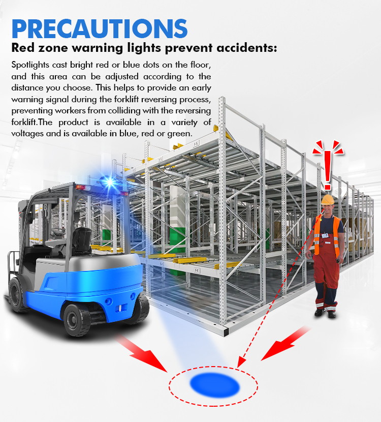 Enhanced Pedestrian Awareness: The primary advantage. The highly visible blue spot on the ground instantly alerts pedestrians that a forklift is approaching, even if they are not looking directly at it or if the forklift is around a corner.