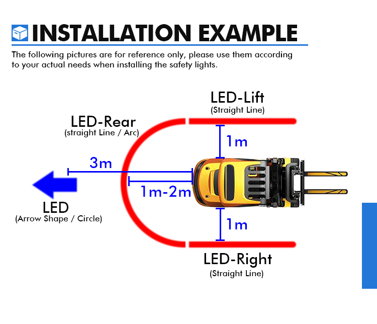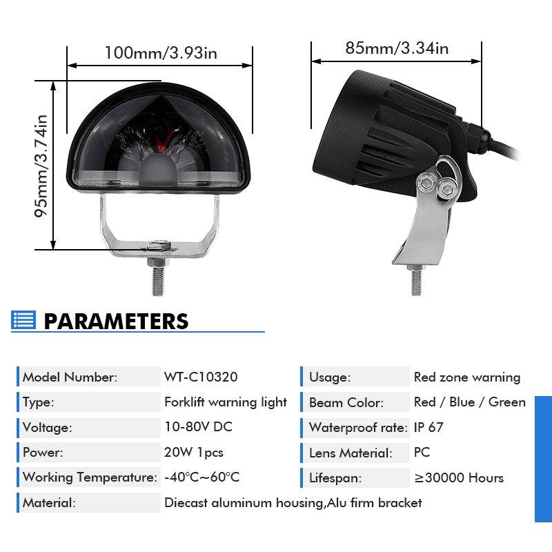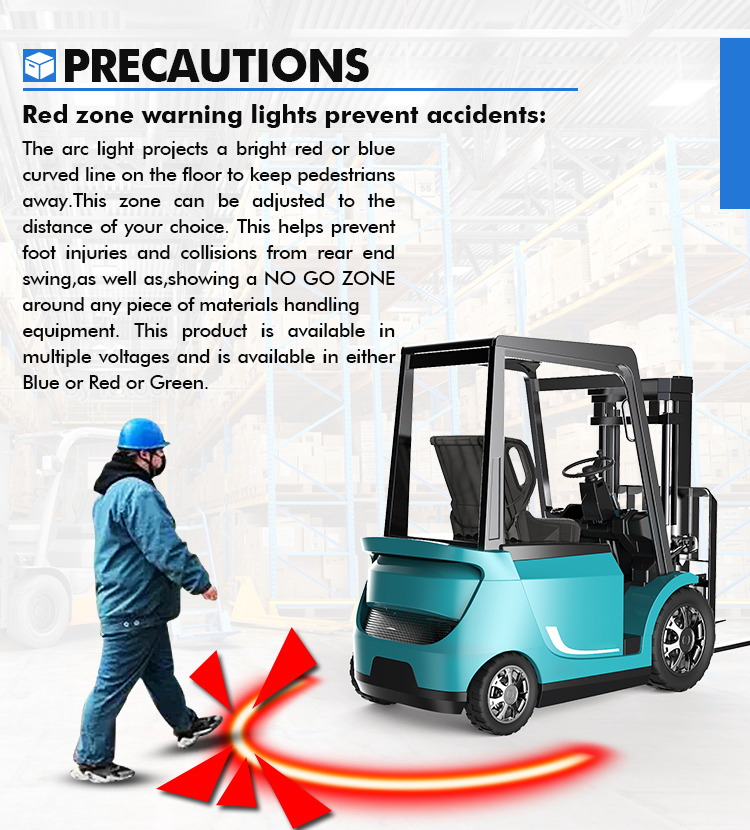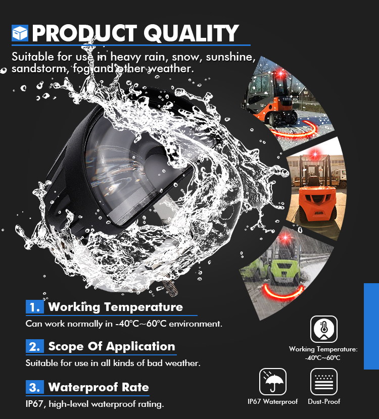 With a wide voltage range of 10-80V, it’s compatible with most forklift models, eliminating the hassle of voltage matching. The IP67 waterproof and dustproof rating ensures reliable operation in rain, dust, mud, and extreme temperatures, making it suitable for both indoor and outdoor use. The high-power 40W LED chip emits a bright, eye-catching ARC light that alerts pedestrians and other vehicles to the forklift’s presence, significantly reducing collision risks.