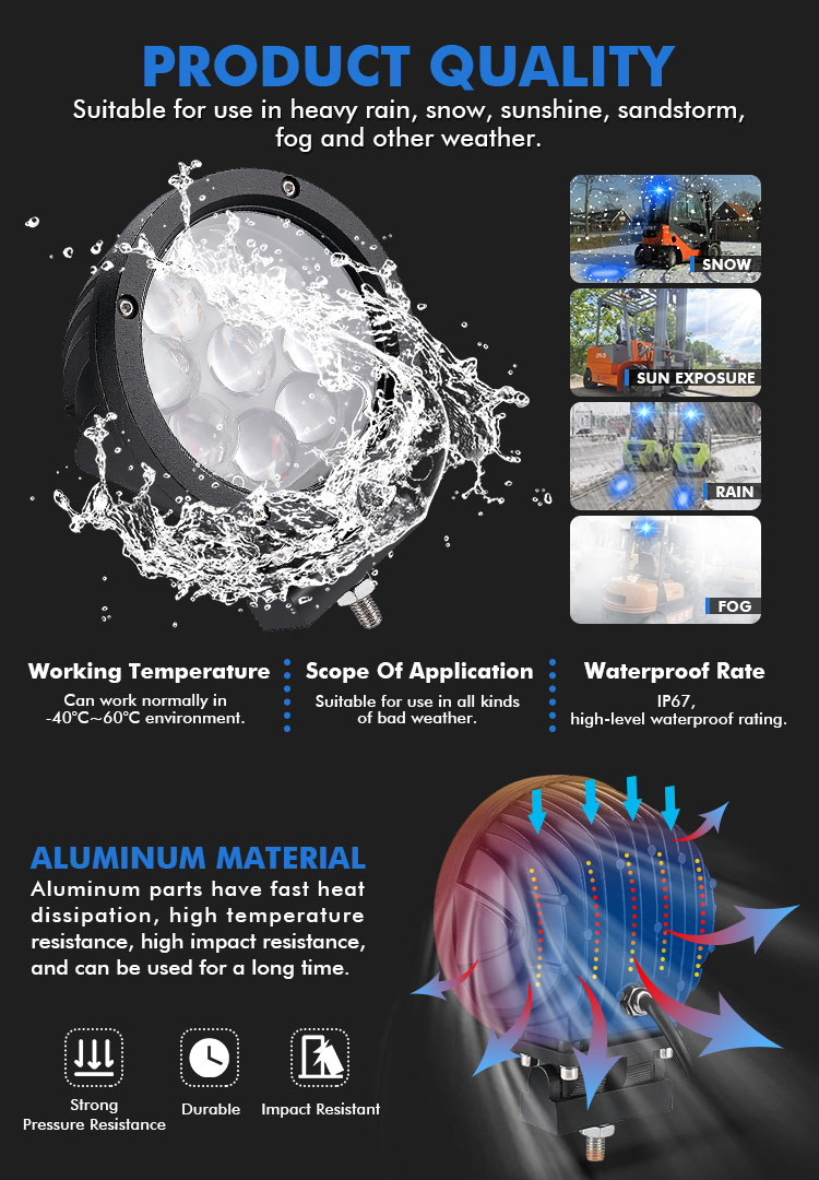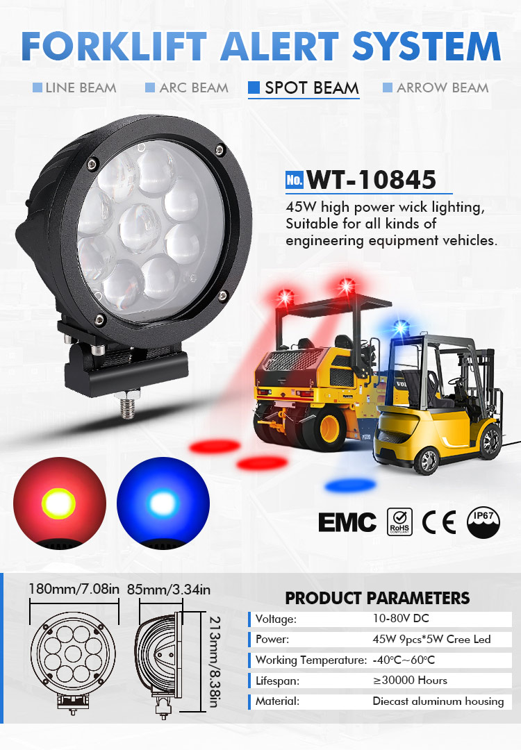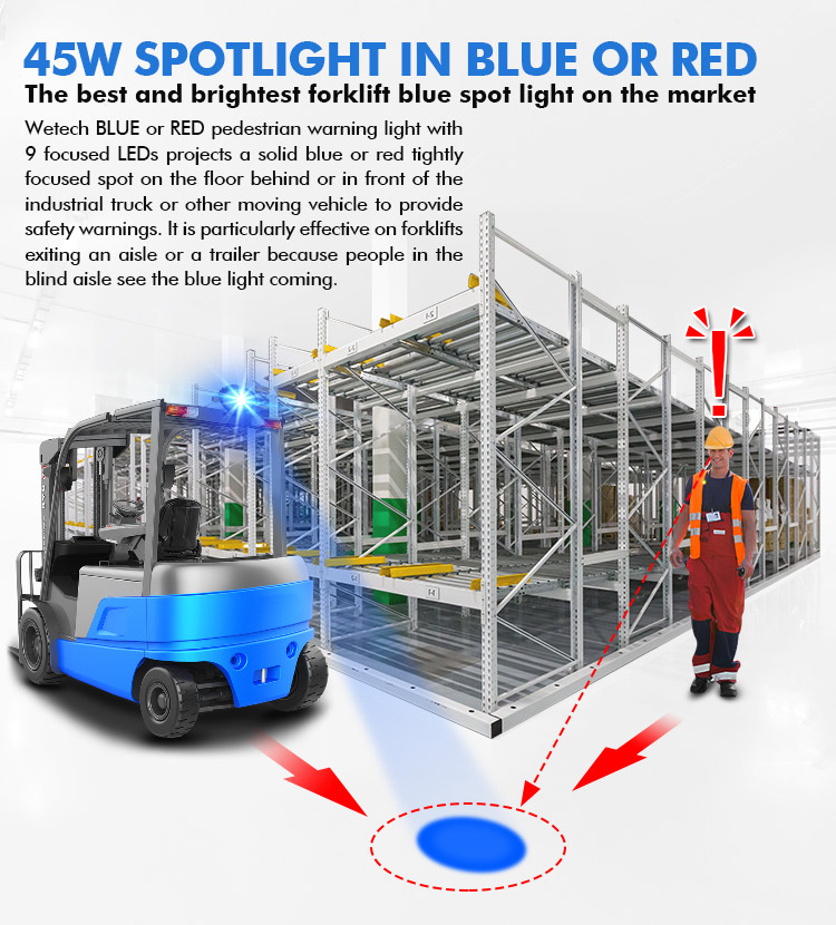 Upgrade your forklift’s safety and visibility with our IP67 Waterproof 45W LED Forklift Blue Spot Light – designed for harsh industrial environments, warehouses, loading docks, and outdoor yards