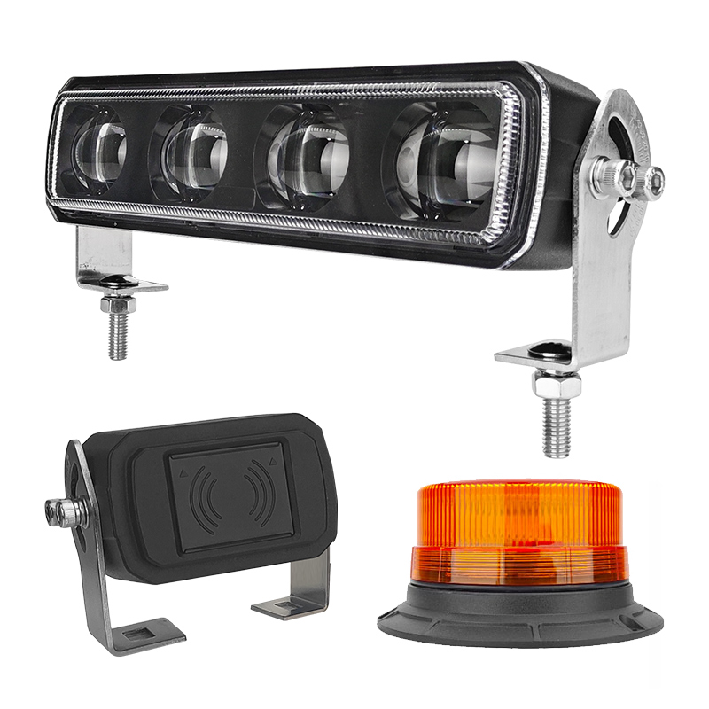 It comes with a radar sensor, red/green dual-color light, beacon warning light, and dedicated cables. All parts are labeled for easy plug-and-play setup, working with most forklift models and monitors