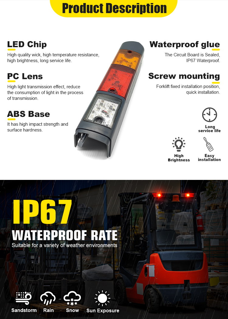 Reliable rear tail light designed for forklifts and trucks, operating at 48V with IP67 waterproof and dustproof rating.