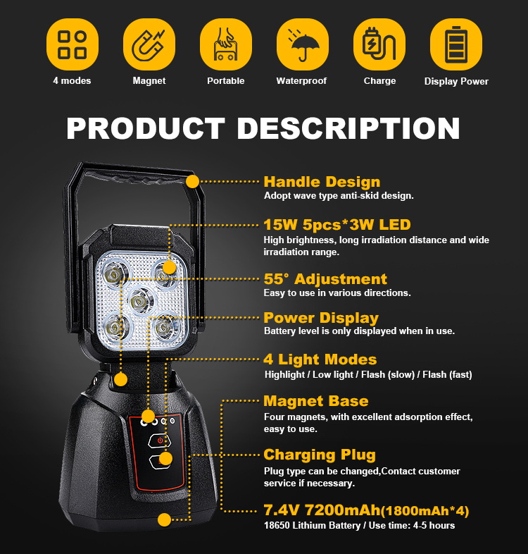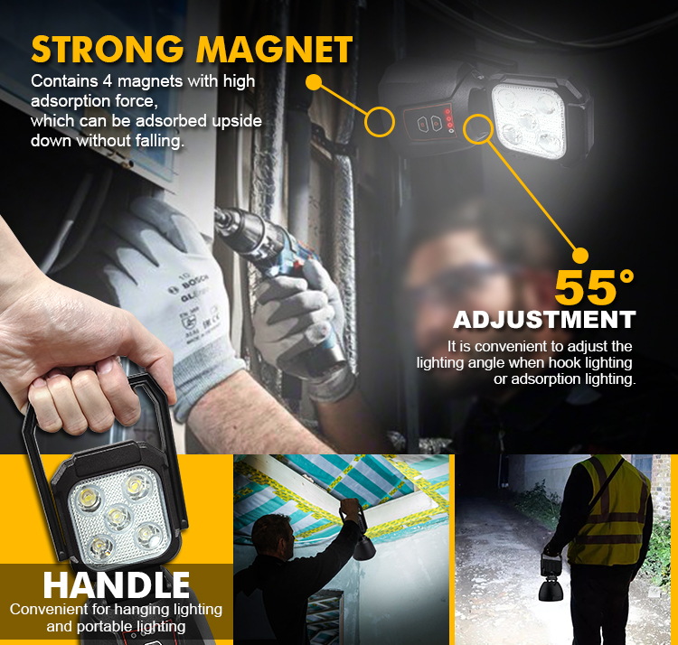 This high-brightness rechargeable LED emergency light features a durable handle design, making it ideal for outdoor work, industrial facilities, warehouses, and emergency situations. The waterproof construction ensures reliable performance in various conditions: