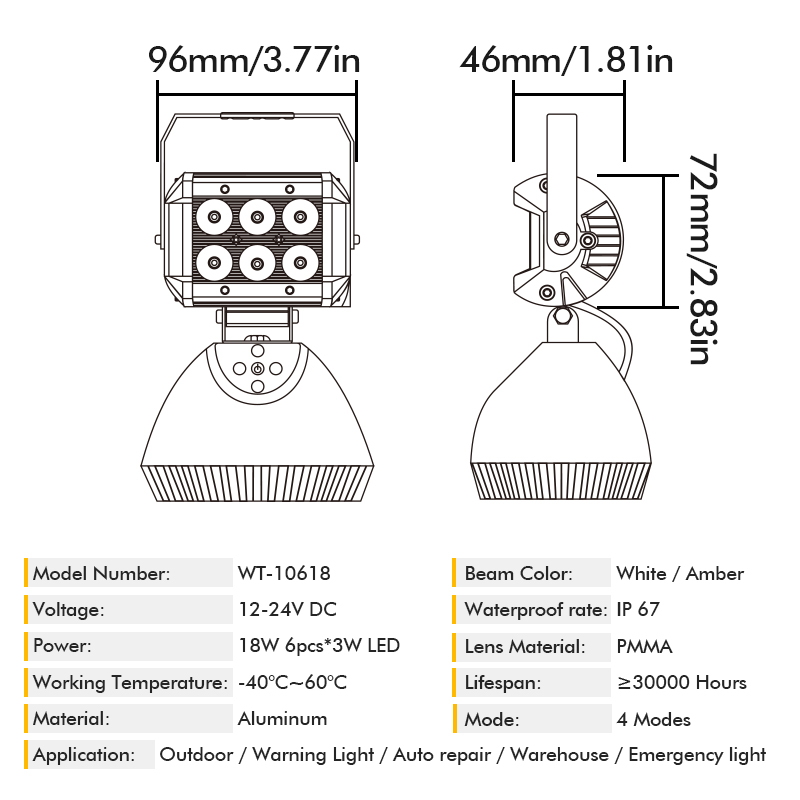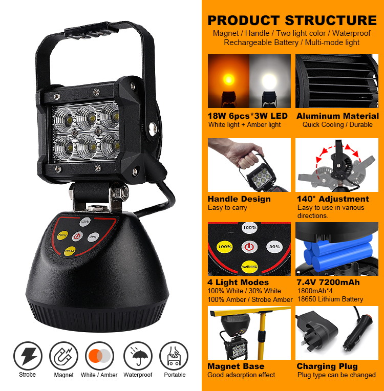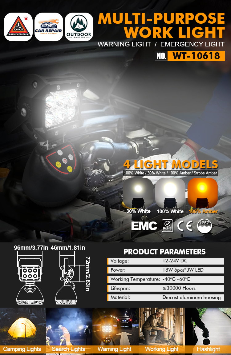 The WT-10618 18W Outdoor Portable Magnetic Rechargeable Camping Light is a dual-purpose lighting tool designed for both outdoor camping adventures and professional work scenarios.