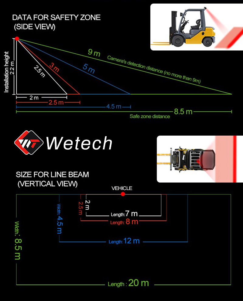 This forklift AI collision avoidance system uses red and green warning lights to detect blind spots and proximity in dangerous areas. It provides real-time alerts, effectively preventing collisions and enhancing operational safety.