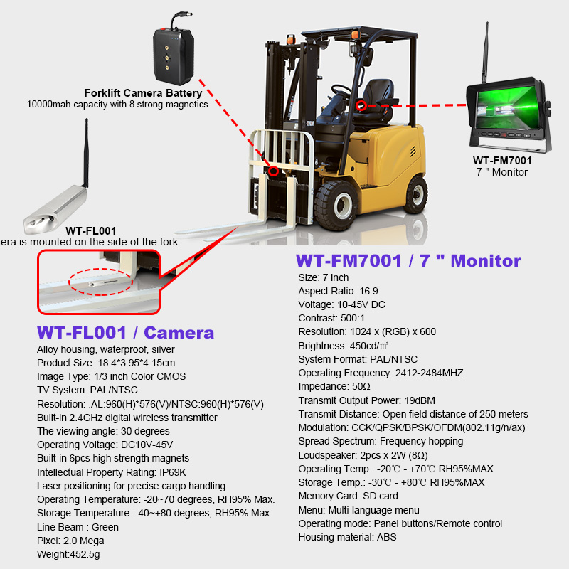 Upgrade forklift safety and efficiency with the Wireless Forklift Camera Monitor System – designed to eliminate blind spots, maintain safe pedestrian distances, and enable precise cargo positioning in warehouses, loading docks, and industrial yards
